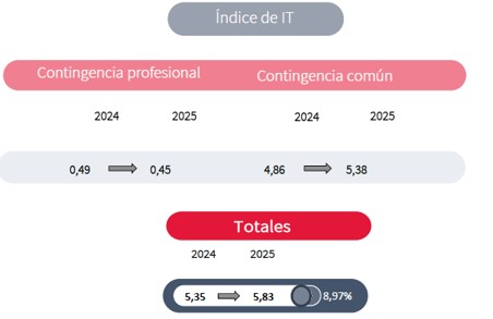 Durante el período analizado de 2025, el índice de incapacidad temporal (IT) se sitúo en 5,83 días de baja por cada 100 días cotizados, lo que representa un incremento del 8,97% en comparación con el mismo período del año anterior.