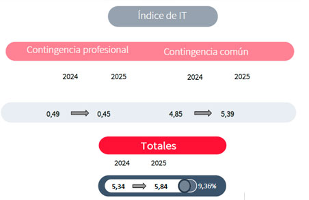 Durante el período analizado de 2025, el índice de incapacidad temporal (IT) se sitúo en 5,84 días de baja por cada 100 días cotizados, lo que representa un incremento del 9,36% en comparación con el mismo período del año anterior.
