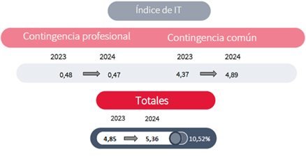 Al igual que en el indicador de incidencia media, el incremento de este índice se debe a la evolución de la contingencia común, que con un índice de IT de 4,89 tuvo un incremento del 11,90%, mientras que en índice de IT por contingencia profesional fue de 0,47, lo que supuso una disminución de -2,08% con respecto al año 2023.