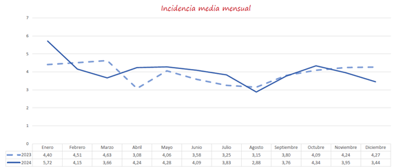 El índice de incidencia sufrió variaciones a lo largo del año, siendo enero el mes con mayor incidencia media mensual (5,72) y agosto el de menor (2,88).