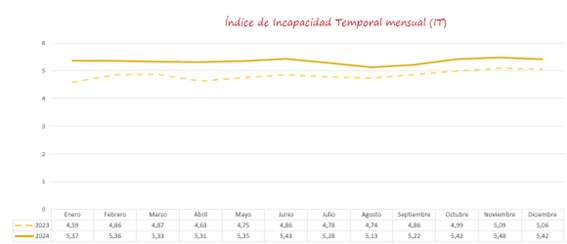 Respecto al índice de incapacidad temporal (índice de IT), en el año 2024 por cada 100 días cotizados se han registrado 5,36 días de baja, lo que ha supuesto un incremento del 10,52% respecto al año anterior.