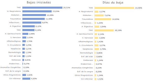 trastornos mentales y de comportamiento (TMC) con un 16,19% sobre el total de días de baja.